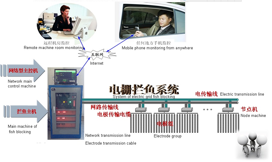 At present, blocking fish with electric screen is the one of main methods to prevent stocked fish in natural water from escaping. It is based on electric field in the water to stimulate fish, which has the reaction of preventing electric for the electric field in the water, thus to achieve the result of blocking fish.